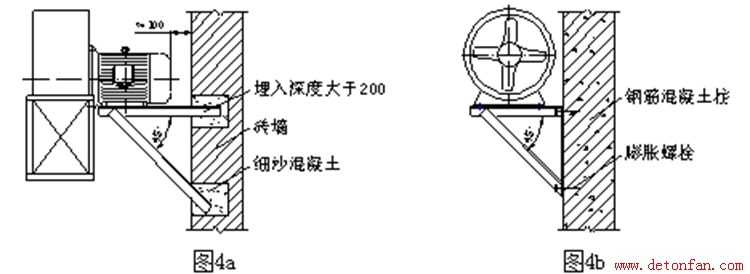 ②一般只限于A式傳動的通風機允許安裝于墻(柱)上。通常采用鋼結構支架來進行安裝 (圖4a、圖4b) 。